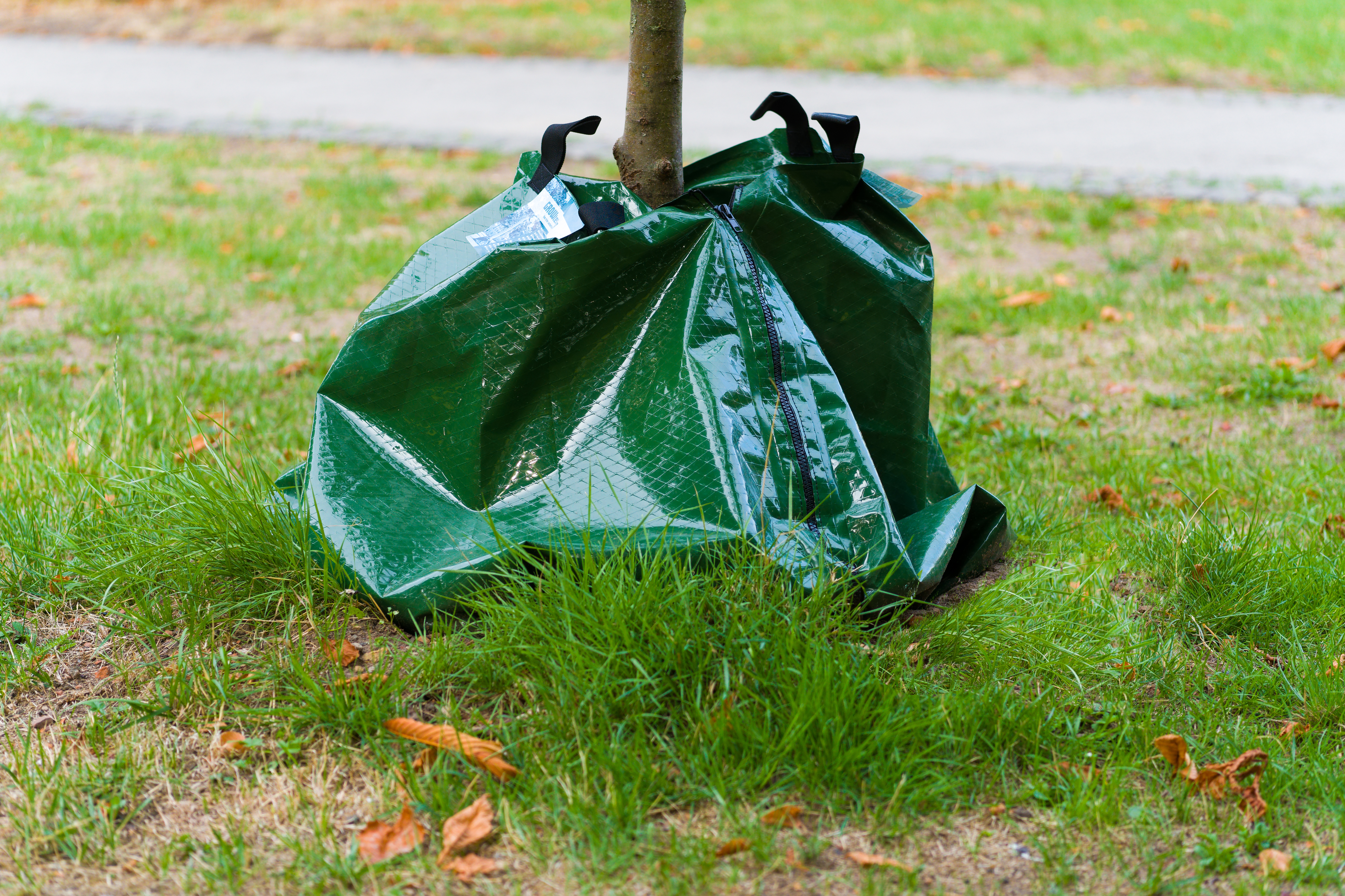 Die Anwendung ist denkbar einfach: Der Sack wird um den Baumstamm gelegt, mit Wasser befüllt und verschlossen.